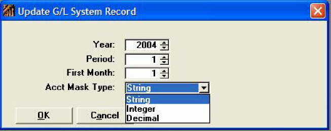 This window allows the user to update GL information that affects the entire system, including Accounting Period, Year, Base Month, and Account Number type. The system supports GL Account Numbers that are alpha numeric strings, integers, and decimals.